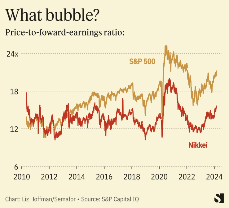 By one measure, Japan’s stocks still look cheap, meaning there could be more gains ahead. The Nikkei is trading around 15 times the annual profits of its component stocks, versus about 20 times for the S&P 500.