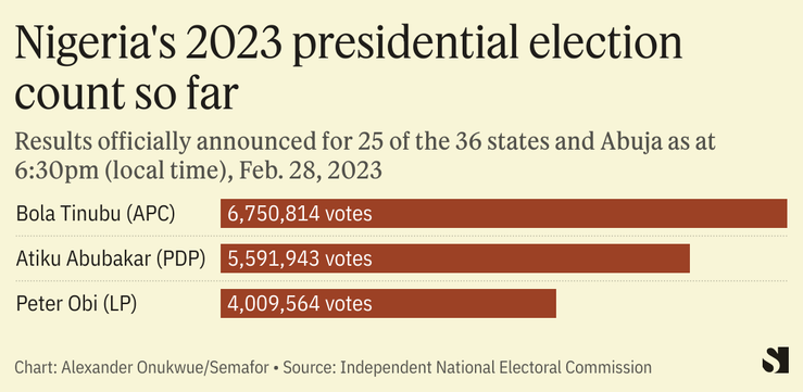 The officially declared results by INEC so far show Bola Tinubu of APC leads with 39% of votes cast for the 25 states that have been called, ahead of Atiku Abubakar (People’s Democratic Party) and Peter Obi (Labour Party).