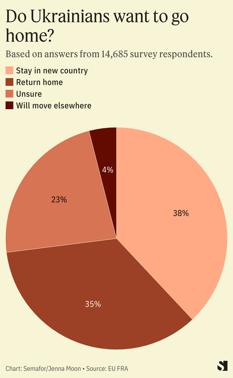 More than a third of Ukrainian refugees living in the European Union want to return home, according to a survey by the EU Agency for Fundamental Rights (FRA).