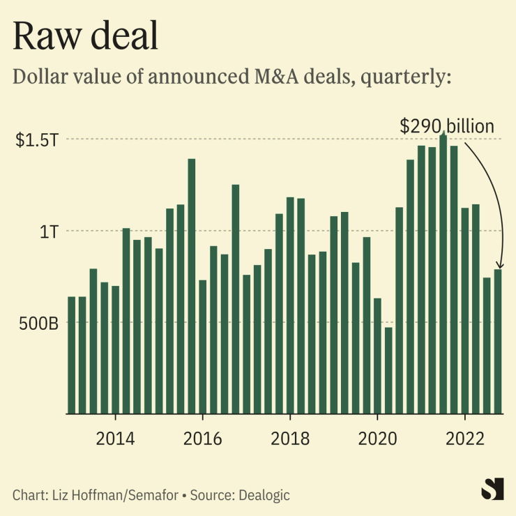 Global mergers fell 37%, by dollar value, last year from 2021’s record high, according to Dealogic, the biggest annual drop since the dot-com bubble burst. While much of that can be blamed on recession fears and higher interest rates, which make takeovers more expensive, governments’ anti-merger turn is partly to blame.