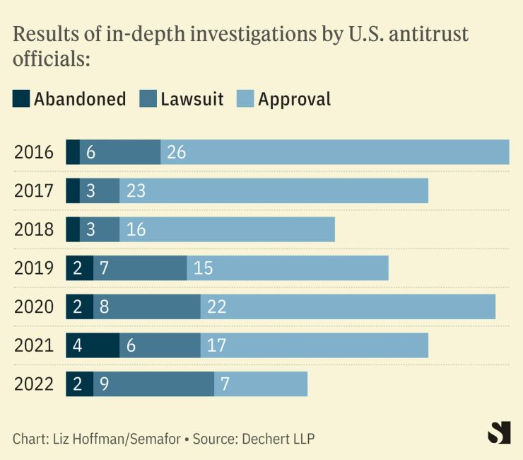 It became one of at least 35 transactions that were abandoned or blocked on antitrust grounds since the Biden administration took office, according to law firm Dechert. Every investigation that wrapped up in the third quarter of 2022 ended with a scuttled deal.