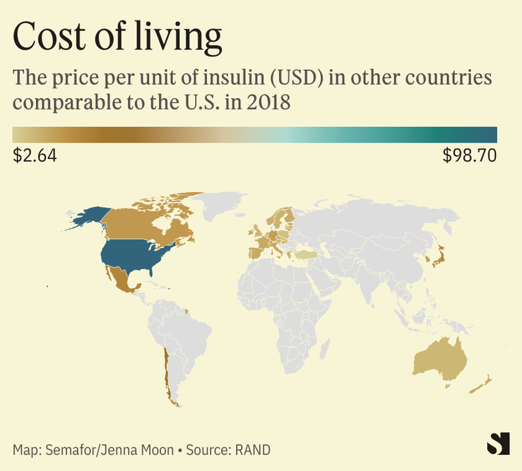 According to 2018 data from American nonprofit RAND, the price per unit of insulin in the U.S — $98.70 — is roughly four times higher than other countries.