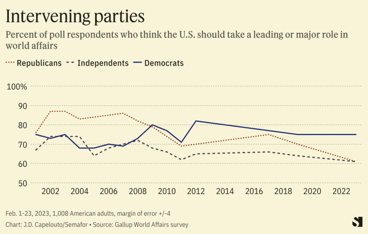 That shift was primarily driven by Republicans who have increasingly wanted the U.S. to minimize its role in world affairs.