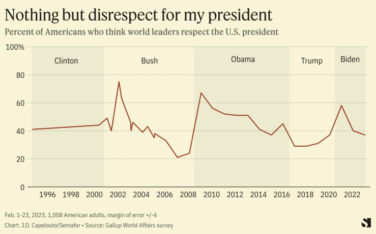 Just 37% of respondents think world leaders have some respect for Biden; down from 58% in February 2021.