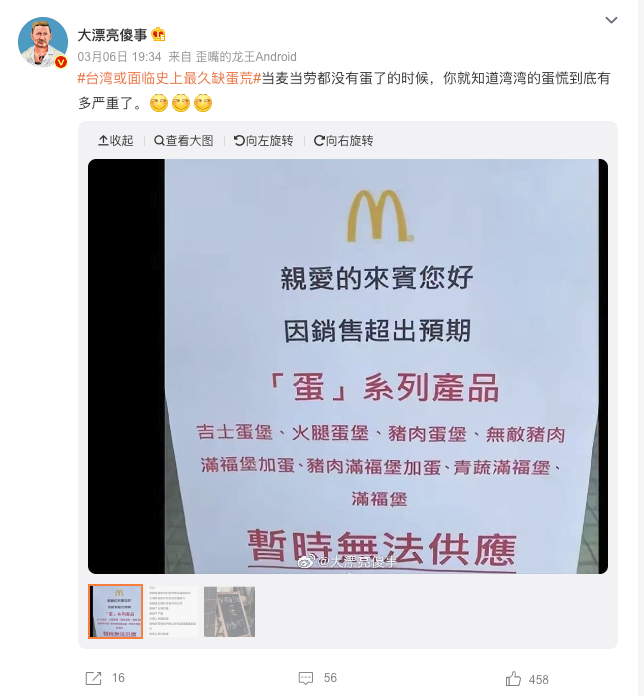 On Weibo, users from mainland China mocked Taiwanese people for complaining about the egg shortage.