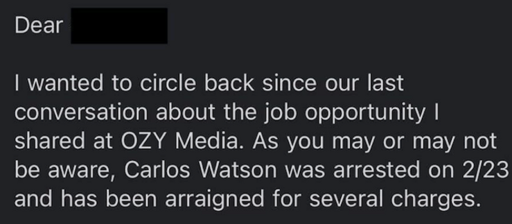 I wanted to circle back since our last conversation about the job opportunity I shared at OZY Media. As you may or may not be aware, Carlos Watson was arrested on 2/23 and has been arraigned for several charges.