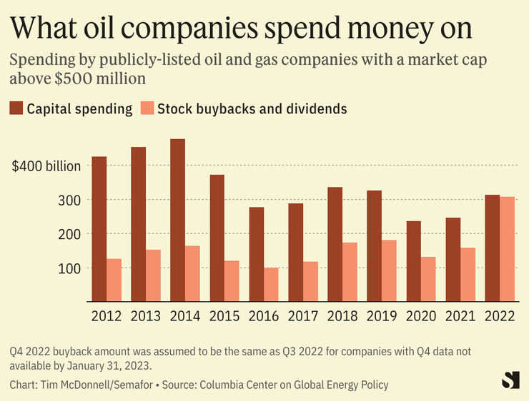 And despite the rhetoric around low-carbon production, most oil and gas companies are spending far more on their traditional business than they are on climate solutions. Spending by the five largest oil and gas companies on low carbon projects — including renewables, hydrogen, carbon capture, and biofuels — was about 13% of total capex on average in 2022.