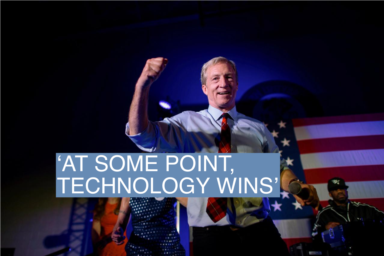 Tom Steyer: The tide is coming in for renewable power and there’s not much that can stop it. You don’t like renewables? That’s fine, but if dirty energy costs 5 cents and clean energy costs 1 cent consumers will choose the cheaper option every time. It’s just business, plain and simple. Do I think we can go back to the 1950s and have Esso stations charging 33 cents a gallon? No. More importantly, why would we want to? There are two very different views at work in the world, but between the industrial logic and competitive dynamics, it’s like, ‘sorry, the tide has come in. we’re here — the energy transition is underway’.”