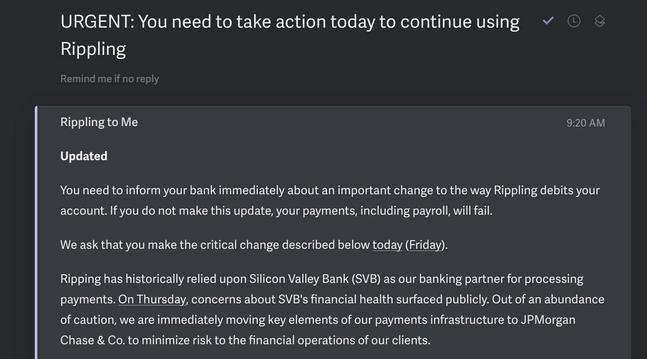 He and hundreds of other startup founders got an email this morning from Rippling, a payroll processor that used Silicon Valley Bank to cut its checks, saying it was moving its accounts to JPMorgan.