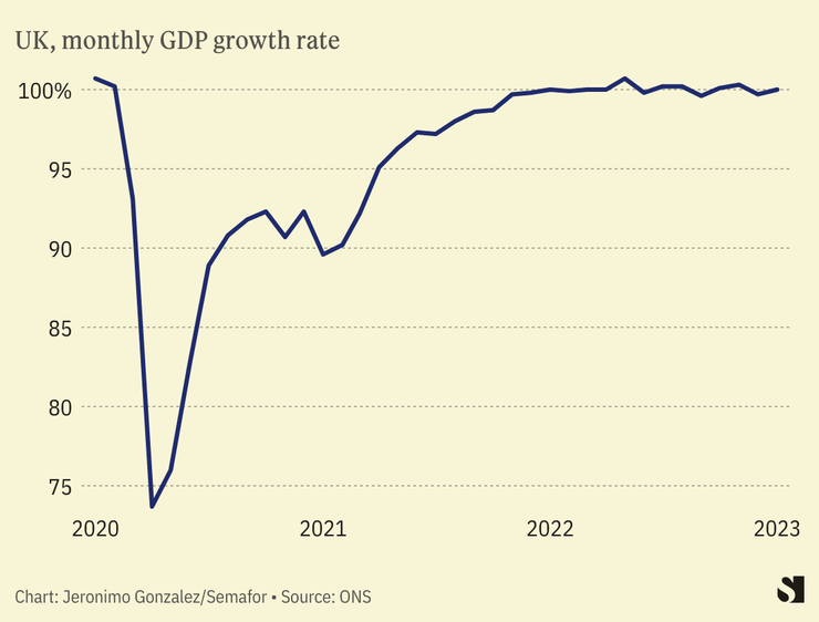 The ONS credited the return of Premier League events for some of the economic rebound: Sports and recreation grew 8.9% after the domestic football league resumed its full schedule following a December pause for the World Cup.
