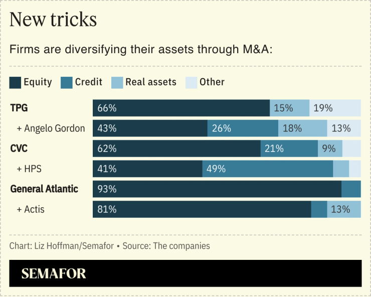 That’s driving firms to merge. TPG, one of the last big pure-play buyout shops, bought credit and real-estate shop Angelo Gordon last year. General Atlantic is buying infrastructure specialist Actis. Brookfield bought Deutsche Bank’s fund-stakes business. CVC has already dabbled, in September buying a Dutch infrastructure firm that owns data centers in Phoenix and a tram line in Belgium. BlackRock is buying infrastructure giant GIP and has signaled that it’s looking for a needle-moving takeover in credit. That list doesn’t mention the scramble among asset managers to buy up insurance companies.