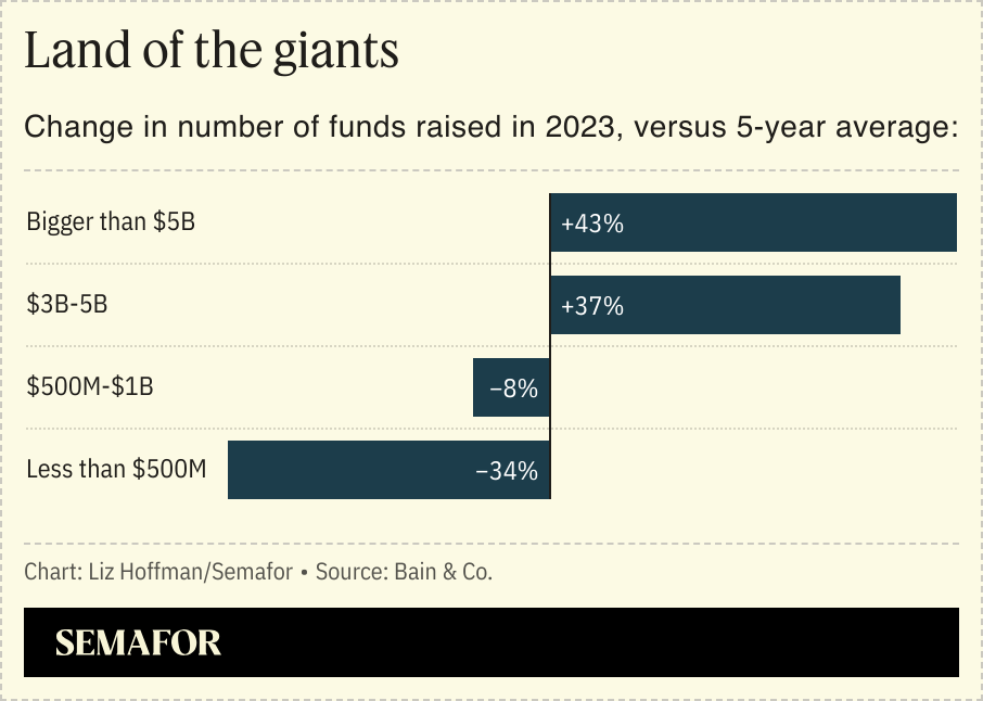 As in all contracting industries, the biggest players are winning. Investors are concentrating their money with larger managers, which can offer more products and discounted fees. First-time fund managers are finding few takers. The number of $5 billion-plus funds rose by a third in 2023 from a year earlier, while the number of sub-$500 million funds shrank by a similar amount, according to Bain.