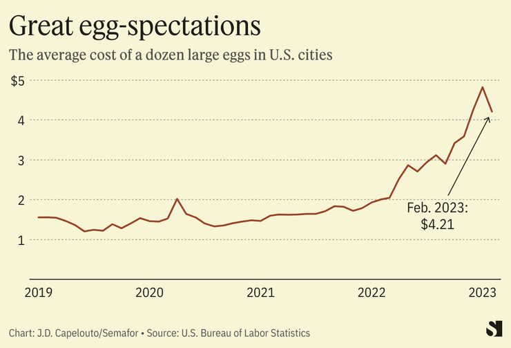 A dozen large eggs cost an average of $4.21 in February, down from a record-high $4.82 in January.
