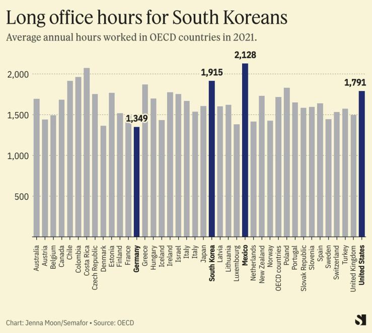 South Korea has among the highest work-hour averages within OECD countries, and as of 2021 recorded an average of 1,915 work hours, compared to 1,607 on average in Japan.
