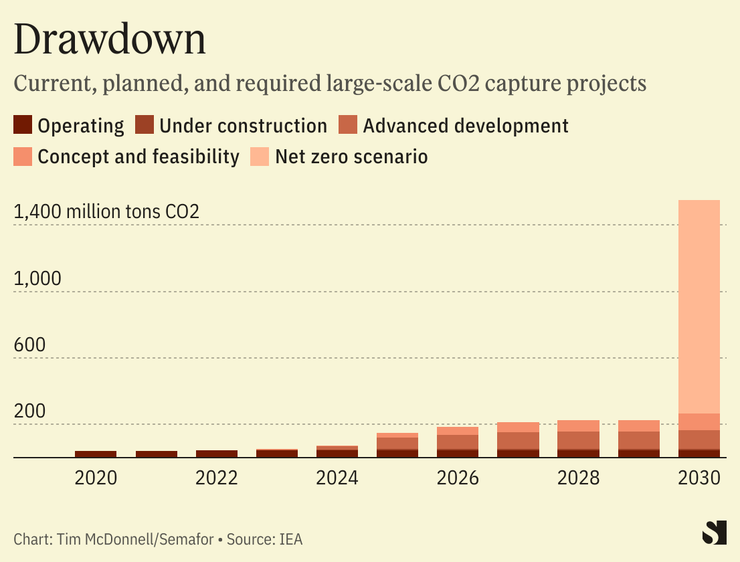 Most carbon captured today is sequestered via “enhanced oil recovery,” a process in which it is injected into oil wells to push out the last drops. That type of use has helped make early-stage carbon capture facilities economic. But to reach the necessary scale, most CO2 will need to be injected deep underground into formations of porous rock. The Inflation Reduction Act doubled the tax credit available for geologic carbon storage, to $50 per ton.
