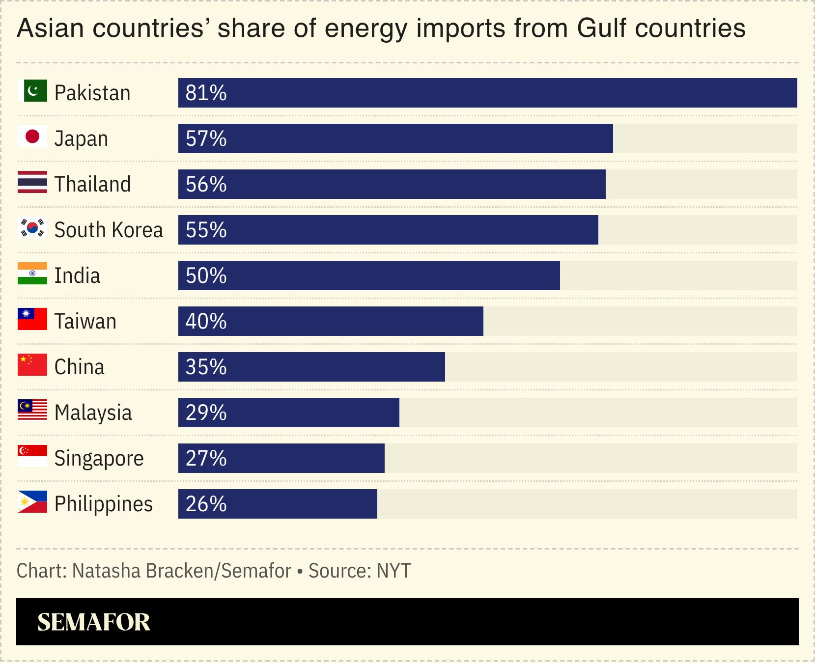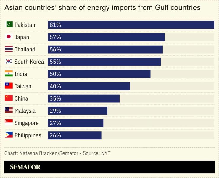 Several of Asia’s biggest economies import more than 50% of their energy from the Gulf. The crunch has forced business closures in Japan, while South Korea has asked people to take shorter showers and to use bicycles to get around.
