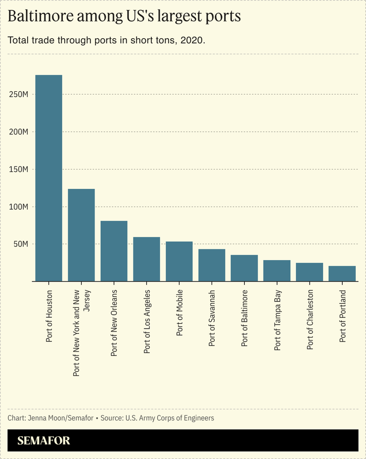 Baltimore is America’s 20th-biggest port, and imports more cars and light trucks than any other, according to The New York Times, and companies including Amazon, Volkswagen, and FedEx have facilities there. One shipping analyst warned of “a ripple effect” as ships headed to Baltimore are routed to ports in New Jersey or North Carolina, while Bloomberg said the port’s closure could send more ships through ports on the West Coast. Any delays or increases in freight costs would hit companies already under pressure from security concerns in the Red Sea and a drought in the Panama Canal. Shares of Danish shipping giant Maersk fell as much as 6% today.