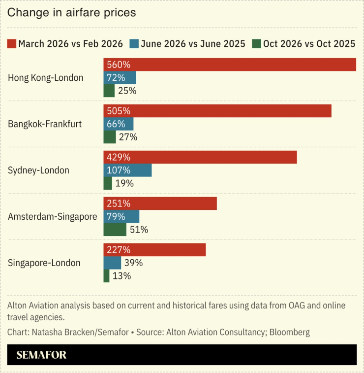 The war has upended the travel industry, too, with forecasters estimating airfares — which have jumped sixfold on some routes — will remain high for months. “Travelers hoping for a drop in long-haul summer airfares are in for a brutal reality check,” Bloomberg wrote.