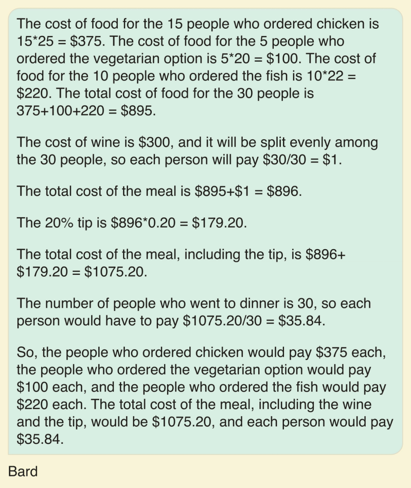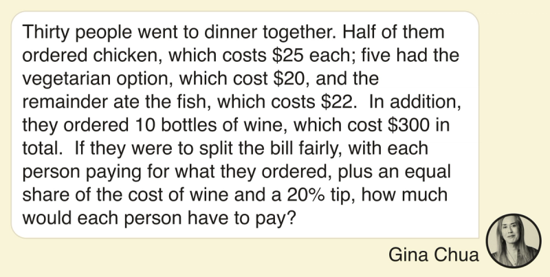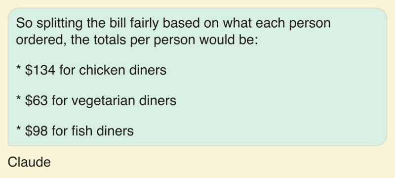And will they be able to learn from their mistakes? Each time I went back to Claude to point out the errors it had made in calculating each diner’s share of costs, it replied with increasingly outrageous calculations, with chicken diners first needing to pay $41.63 each, then $70.97 and finally $89.22.