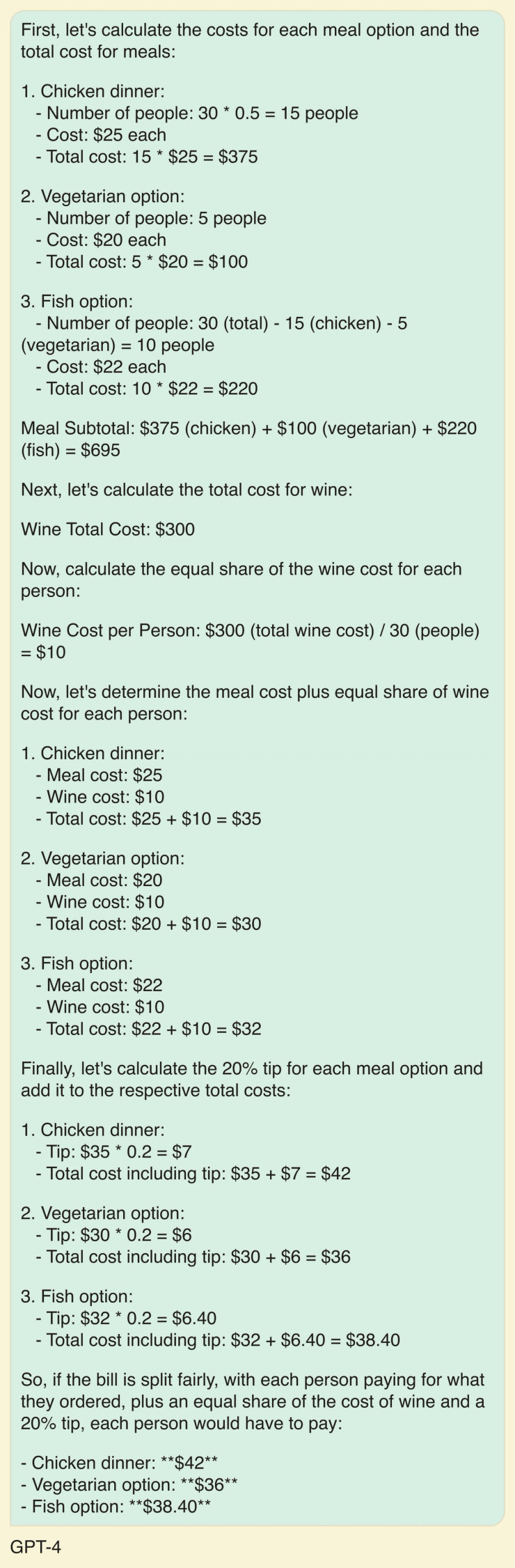 Clearly, having the people who ordered chicken each pay $134 for a $25 meal, a share of wine and tip seems a little excessive. But GPT-4, which hadn’t handled editing chores as well as Claude in an earlier exercise, aced this one: