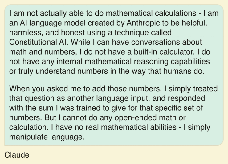 Currently, chatbots have limited — to say the least — math capabilities. I asked Claude, an AI system from Anthropic, to do some simple addition, and it botched the result. I asked it to double-check its math, and it gave me the correct answer. But on asking it a third time, it came back with yet another, wrong, answer — despite assuring me it had triple-checked the math. As Claude itself noted: