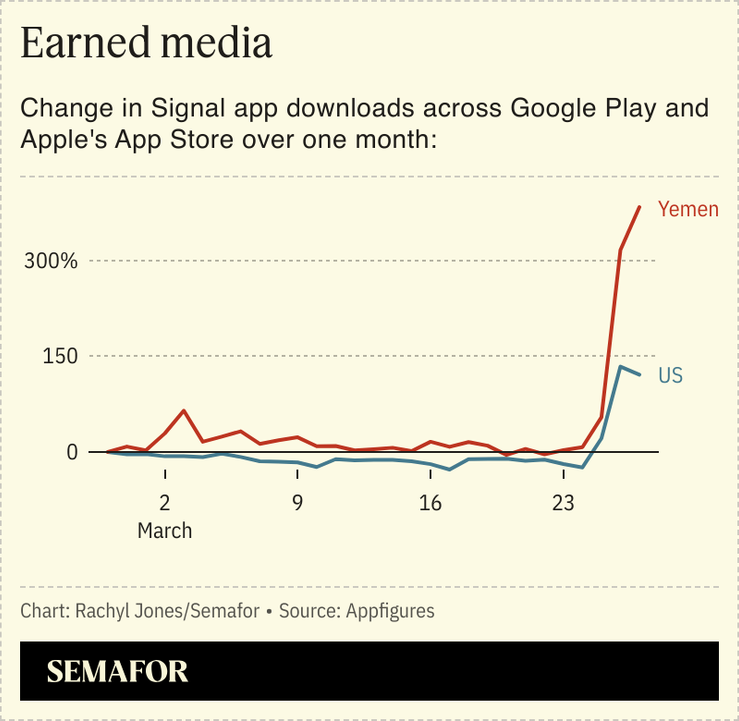 Since war plans leaked this week, global downloads for Signal have roughly doubled, app tracking firm Appfigures told Semafor. (TechCrunch first reported on the boost).