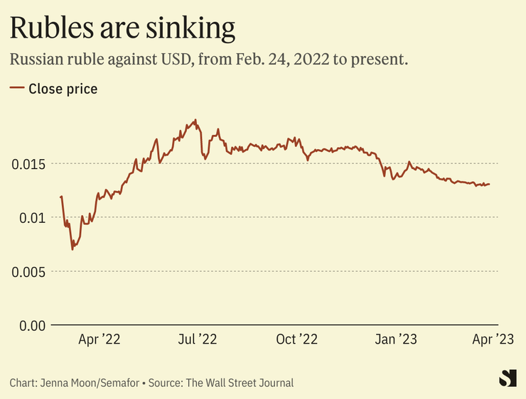 The value of the ruble against the U.S. dollar has been sinking since November. Speaking to The Wall Street Journal, Maria Shagina, senior fellow at the International Institute for Strategic Studies, said that while the country saw short-term resilience, the view going forward is not so good: “Moscow will be much more inward-looking and overly dependent on China,” she said.