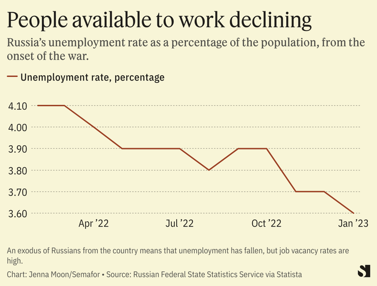 For every unemployed Russian, there are roughly 2.5 job vacancies, data from Russian consultancy firm FinExpertiza shows. The shortage of people to fill roles will hamper Russia’s economic growth, Natalia Danina, head of the analytical department at HeadHunter, told Bloomberg. “Either there are no people or they are not seeking to change jobs amid difficult external circumstances,” she said.