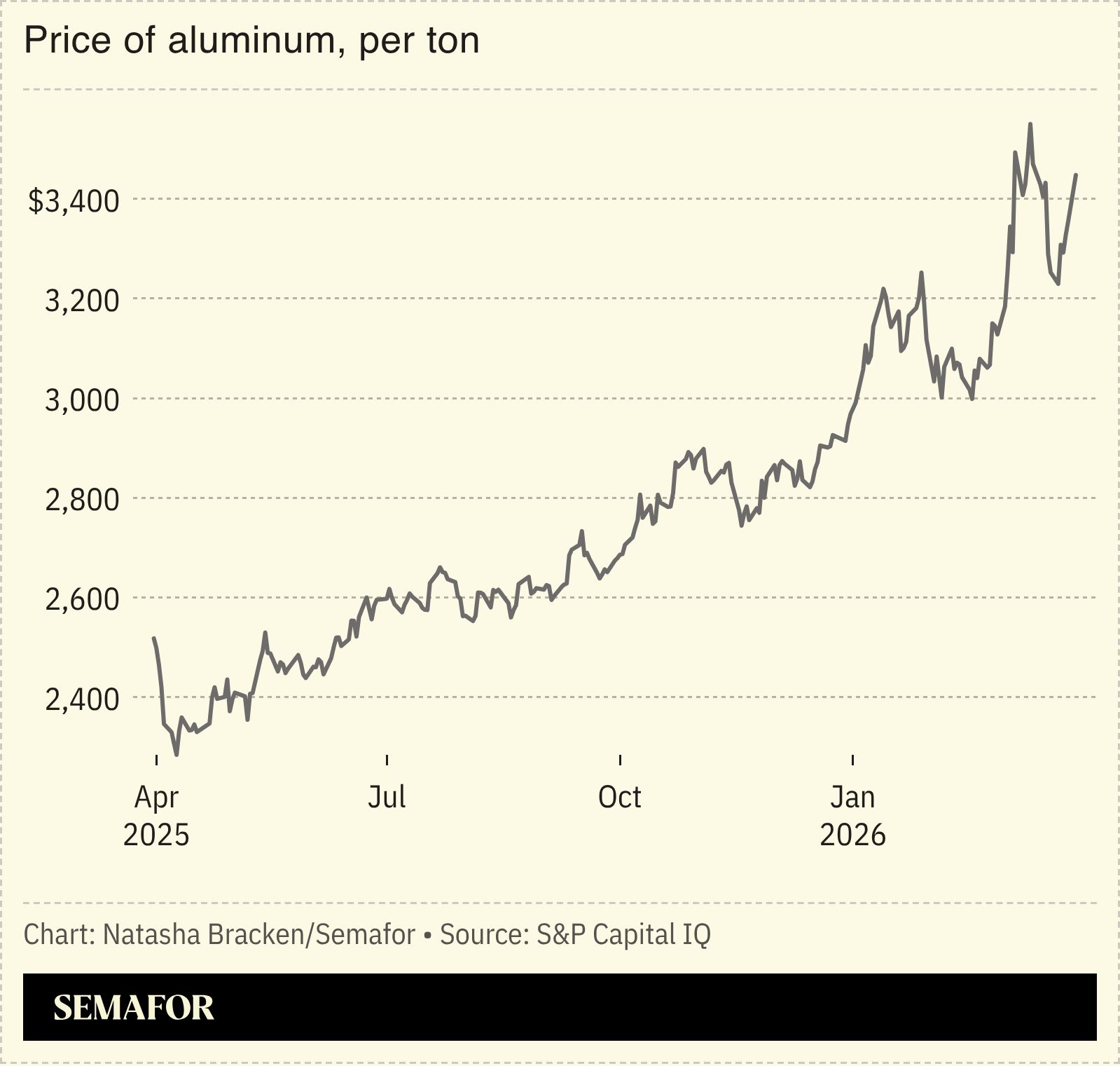 Export shipments to the US and Europe had already come to a halt because of the effective closure of the Strait of Hormuz, and Morgan Stanley economists singled out aluminium as carrying a high level of risk across the value chain. Andy Farida, an aluminium analyst at Fastmarkets, told Semafor that high prices would be passed on to end-users, ultimately causing demand destruction. “A prolonged shutdown (with little to no alternative supplies other than Russia and China) could cripple the supply of aluminium to support the production of clean and green technology,” he said, adding that relief could come “if governments allow some sanctioned Russian and Chinese aluminium to be imported.”