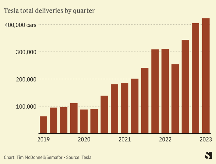 In January, Tesla slashed prices by up to 20% on some models in a bid to juice sales, especially as the EU and China rolled back some EV subsidies. The move seems to have paid off: On Monday, Tesla said it delivered 422,875 cars in the first quarter of 2023, slightly below analysts’ expectations but still a record.