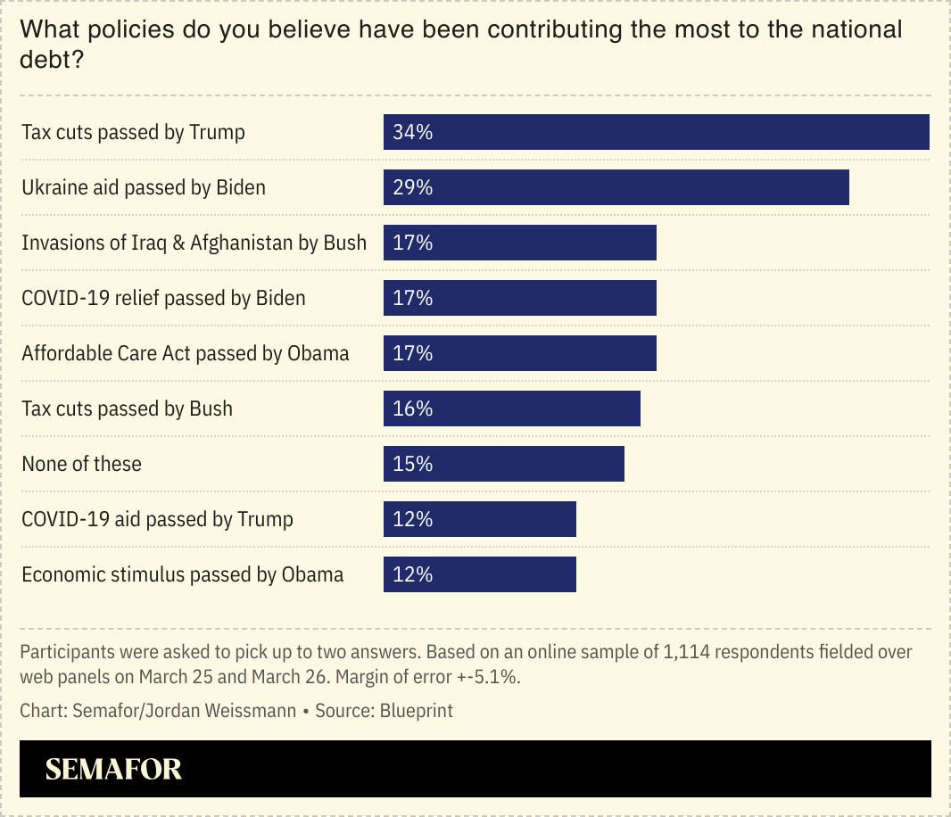 But there are messaging opportunities for Democrats: The most popular answer for why deficits are up are Trump’s tax cuts, including with Haley voters, and Black and Latino voters under 45, who are all seen as swing voting blocs. The next most popular response: Ukraine aid, which is vastly smaller in scope, but central to Congressional debates all year.