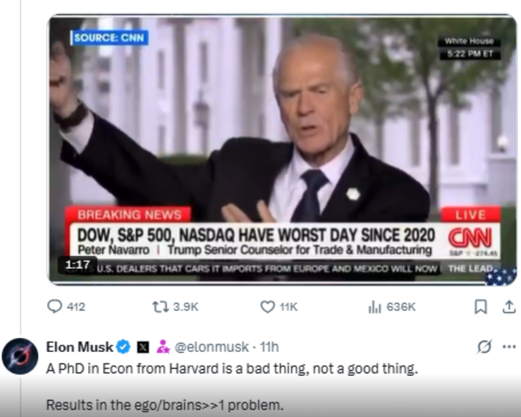 Musk, who has largely stayed out of the growing debate over Trump’s decision to go all-in on tariffs, responded early Saturday morning to a post from an X user praising Navarro, a longtime Trump aide and key architect of the president’s tariff announcement. The Tesla co-founder argued that “A PhD in Econ from Harvard is a bad thing, not a good thing,” adding that Navarro hadn’t “built shit.”