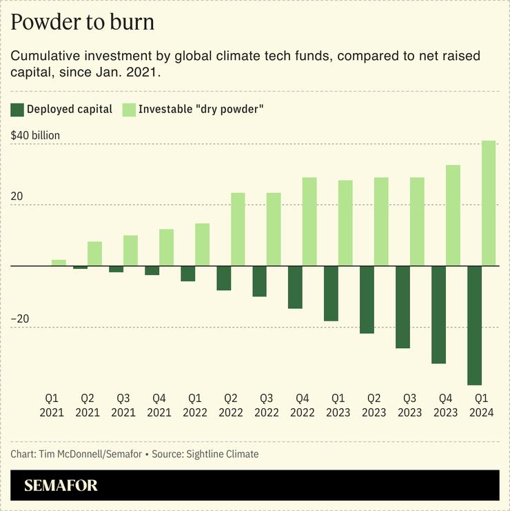 Since January, climate funds — including venture capital, private equity, and infrastructure funds — have raised at least $28.2 billion, mostly in eight “megafunds,” such as Brookfield’s $10 billion Global Transition Fund. Add up fundraising since 2021 and deduct what has already been invested — and money is indeed flowing out the door — and you’re left with a global climate tech war chest of about $41 billion, according to the analytics firm Sightline Climate.