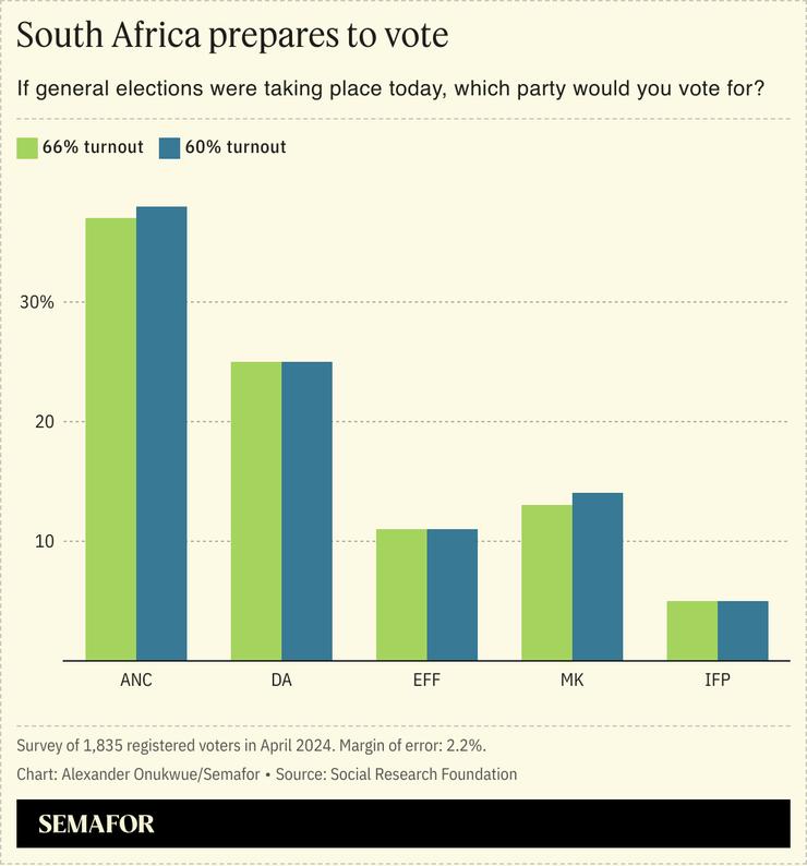 The survey, by the Social Research Foundation (SRF) think tank, provides a snapshot of voter preferences ahead of the May 29 election. It shows the ANC, which needs 50% of the vote to continue governing without entering into a coalition with smaller parties, could win as little as 37%. Meanwhile, Zuma’s Umkhonto we Sizwe party (MKP), was the third most popular party in the survey, with 13%.