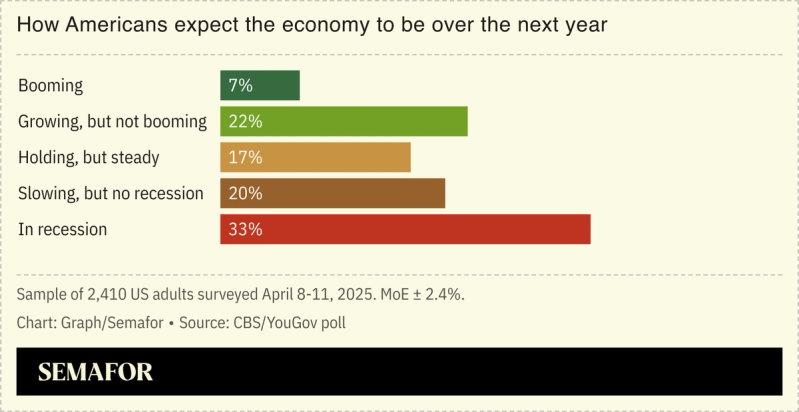 Nearly half of the respondents to a new CBS News poll thought tariffs will increase prices in the long term, while a growing number predict a recession will occur in the next year; the survey was conducted late last week, meaning it captures sentiment even after US President Donald Trump paused most of his new tariff hikes.