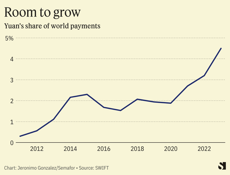However, the role of the Chinese yuan in international markets has increased, more than doubling in the last year. The rise is largely driven by China’s increased demand for Russian oil and gas.