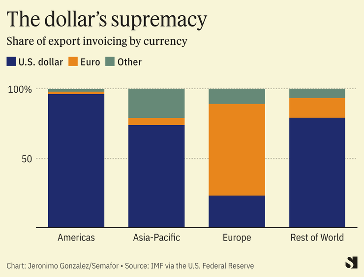 Between 1999 and 2019, the dollar accounted for 96% of trade within the Americas, 74% in the Asia-Pacific region, and 79% in the rest of the world. The only region where the dollar isn’t dominant is in Europe, where the euro leads.