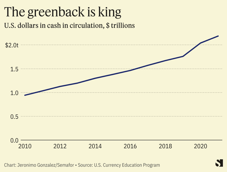 The cash value of dollars in circulation more than doubled in the last decade to over $2 trillion, with as much as half of that estimated to be circulating abroad. Besides the U.S., seven other nations now use the dollar as their official currency: Ecuador, El Salvador, Zimbabwe, Timor-Leste, Micronesia, Palau, and Panama.