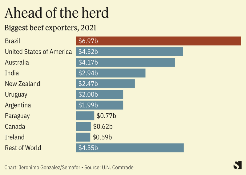 Brazil’s beef industry is the most lucrative in the world, recording nearly $7 million in revenue in 2021. Production has been increasing over the past several years, and doesn’t show signs of slowing down: In the first quarter of 2022, the country exported more than 469,000 tons of beef, an increase of 37% from the same time a year prior.