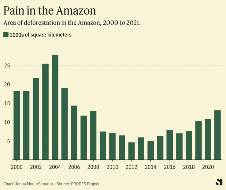 But under former President Bolsanaro, who came to power in 2019, deforestation in the Amazon rebounded, and in 2021 hit a level not seen in over a decade. Forest clearing is now on an upward trend, and the 2020 deforestation rate was 182% higher than the 3,925 square-kilometer (1,515 square miles) legal limit.