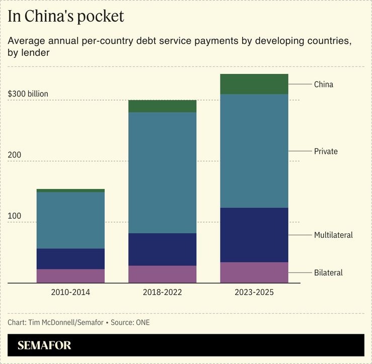 But far more important is a worsening debt pile in developing nations. Last year, for the first time in two decades, developing country governments became net contributors to international finance flows, because they collectively paid more to service debt held by other governments, development banks, and private lenders than they received in new loans and development aid, according to a report last week by the advocacy group ONE. This year, the report projects, developing countries will lose $50 billion on net, because of debt repayments.