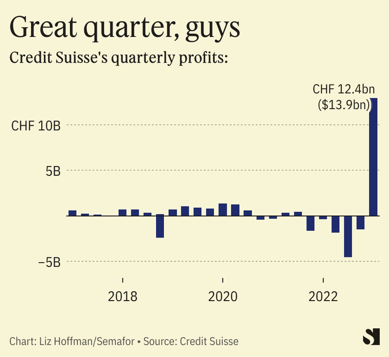 The bank booked $13.9 billion in net income during the three-month stretch in which it nearly failed, saw $75 billion in customer funds whoosh out the door, and was merged by the Swiss government with rival UBS in a firesale.