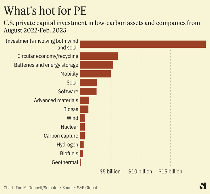 Private equity firms are well-suited to investing in low-carbon technologies. They’re able to front the large volumes of cash needed to build a wind farm or battery factory, and can be more comfortable waiting years to see a return than a public company that has to satisfy shareholders every quarter. A rash of climate tech companies that went public via special-purpose acquisition companies in 2021 and 2022 have since underperformed or gone bankrupt.