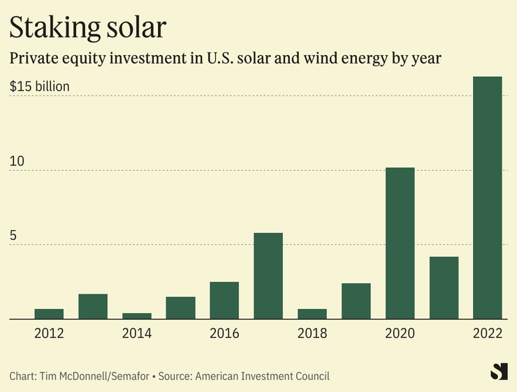 2022 was a record-breaking year for private-equity investment in renewables and other clean energy companies, reaching more than $20 billion in the U.S. Firms like Carlyle and Brookfield unleashed more of the war chests they’d built up from pension funds, wealthy individuals, and other investors.