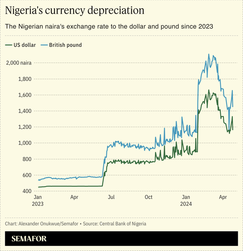 Rising inflation and currency devaluation over the past year have increased production costs in Nigeria. Inflation rose to 33.2% in March, a near-three-decade high. The Central Bank of Nigeria’s intervention in the foreign exchange market, through weekly sales of dollars to licensed traders, has created some stability for the naira’s value. But it remains significantly weaker than it was before Bola Tinubu became Nigeria’s president last May.