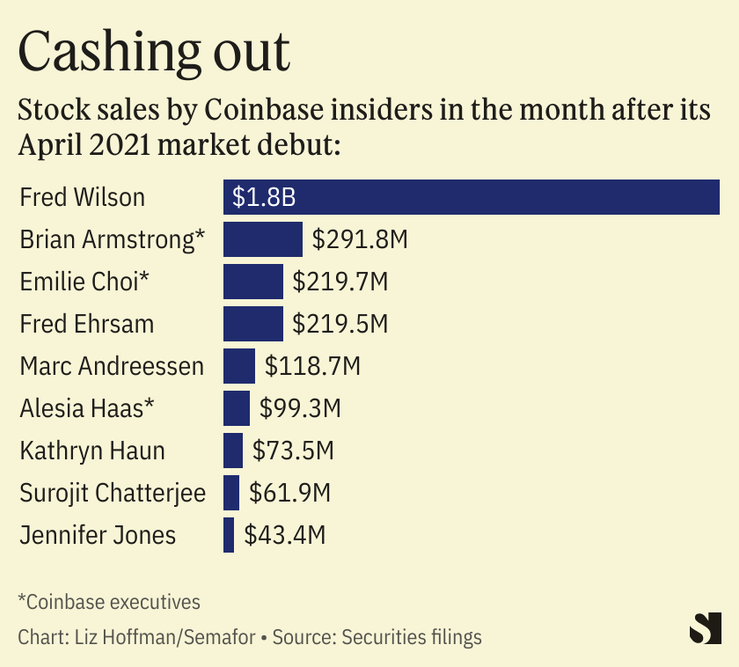 Between Coinbase’s listing on April 14 and mid-May, Wilson sold $1.8 billion worth of stock, CEO Brian Armstrong sold $292 million, and Andreessen sold $119 million, securities filings show.