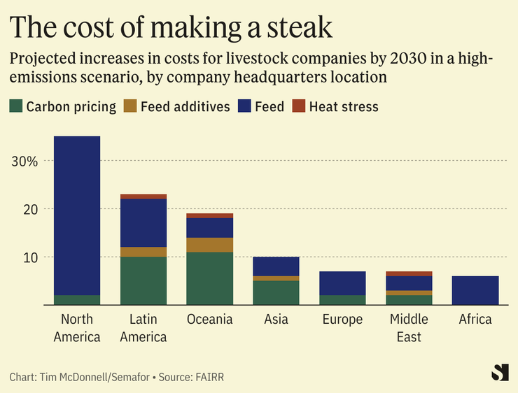 By 2030, the top 40 global livestock companies could see profits fall collectively by nearly $24 billion, according to a recent report by a shareholder advocacy group. Causes include heat stress on animals and rising feed crop prices, as well as the financial toll of carbon pricing and anti-deforestation measures.