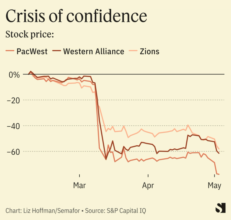 PacWest’s stock fell 60% this morning, following a pattern that has emerged since the collapse of Silicon Valley Bank in March as investors move from one ailing firm to the next. The Federal Deposit Insurance Corp. arranged a sale of First Republic after its shares plummeted on poor earnings that showed customers had pulled about $100 billion from the bank over a few weeks.