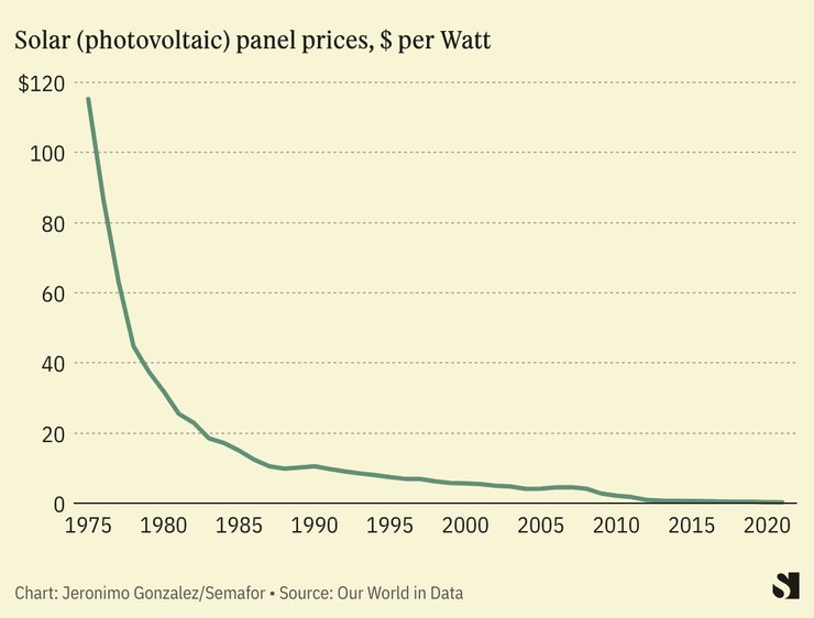 One of my very favorite examples is the graph showing the cost of solar panels. Back in 1975, each watt of additional solar capacity cost $100. By 2010, that was less than a dollar. Now it’s 27 cents. Current solar prices are way below what IPCC models predicted they would be in 2050. The price of lithium-ion batteries per kilowatt-hour, meanwhile, fell by 97% between 1991 and 2018. They’re also longer-lasting and higher capacity than they used to be.