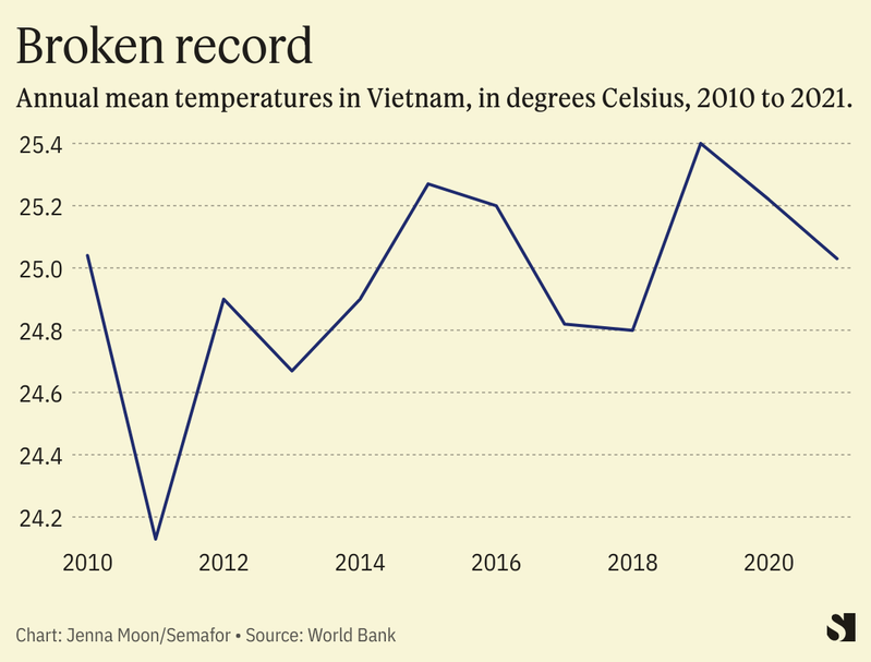 The Vietnamese heat record broke one set the previous day, and is well above the seasonal mean for May: According to the World Bank, temperatures are usually settled around 25 C in Vietnam in May. The mean temperature has been rising across Vietnam over the past decade. Neighboring Laos also recorded an all-time high temperature of 110.3 F (43.5 C) over the weekend.